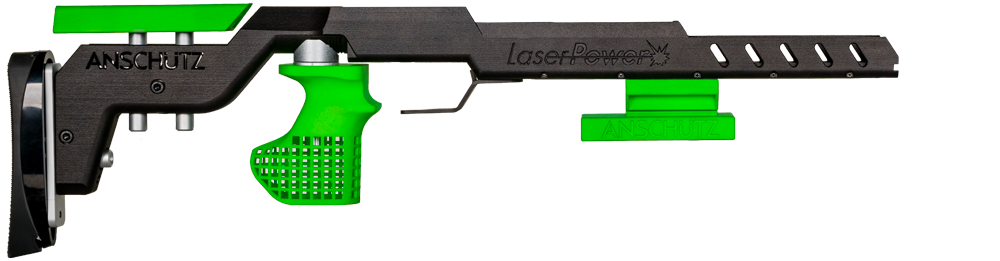 Das absolute Leichtgewicht unter den LaserPower Lichtgewehren. Dieser 3D-gedruckte Lichtgewehrschaft wiegt knapp 810 g und bringt somit in Kombination mit dem LaserPower System nur ca. 2.000 g auf die Waage. Dieses Modell ist in Sachen Gewicht und Abmaße auf die körperlichen Voraussetzungen von ca. 8-12-Jährigen ausgelegt. Auch wurde die Hinterschaftlänge auf die Körpergröße von Kinder angepasst und um 20 mm verkürzt – damit jedes Kind das Lichtgewehr gut anlegen und Spaß damit haben kann. Der Schaft ist mit der robusten und griffigen Gummi-Schaftkappe 4709 A ausgestattet, die sich in der Höhe einstellen lässt. Des Weiteren kann die Vorderschafterhöhung auf drei unterschiedliche Höhen justiert werden. All das mit ansprechenden neongrün gefärbten Anbauteilen!